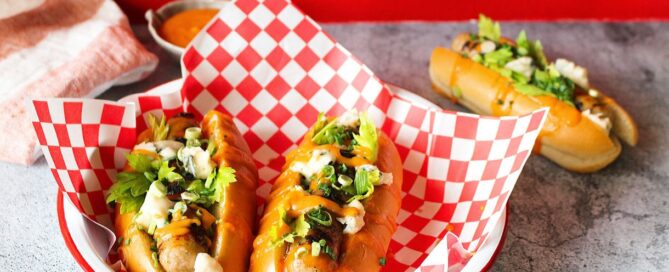 Hot Dogs with Apricot Buffalo Sauce, Blue Cheese, Celery [...]